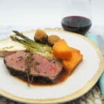 Slice the roast about 1/4 - 1/2 inch thick, about 3 oz portions. Trim any excess fat around the sides if desired before serving.