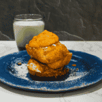 Top French toast with pumpkin butter, sprinkle with powdered sugar, and drizzle with maple syrup. Enjoy with milk.