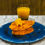 Top French toast with pumpkin butter, sprinkle with powdered sugar and drizzle with maple syrup. Enjoy with orange juice.