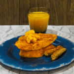 Top French toast with pumpkin butter, sprinkle with powdered sugar and drizzle with maple syrup. Enjoy with sausage and orange juice.
