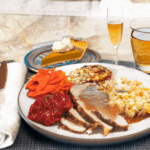 Serve the turkey with cornbread stuffing, root vegetable boulangère, glazed carrots, cranberry sauce, gravy, apple cider, pumpkin pie topped with homemade vanilla ice cream, and hard apple cider.