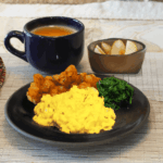 Serve the scrambled eggs with roasted potatoes, sautéed spinach, pear slices and tea.