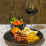 Slice the steak against the grain and drizzle the pan just over top. Serve with mashed potatoes, salad, corn, bread, and wine.