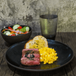 Slice the steak against the grain and drizzle the pan jus over top. Serve with salad, corn, bread, and sparkling water.