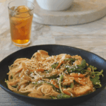 Sprinkle toasted almonds over the noodle salad. Garnish with fresh cilantro leaves and a squeeze of lime. Serve with the iced rooibos tea on the side.