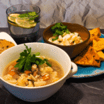 Preheat the oven to 350 degrees. Toss the pita with oil, chili powder, salt, and pepper. Place on a parchment paper lined baking sheet and drizzle with lime juice. Bake in the oven until golden brown and crispy. Then set aside. Pita will continue to crisp up as it cools.