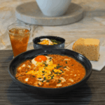 Serve the chili topped with a fried egg, alongside corn bread, cucumber salad, and iced rooibos tea.