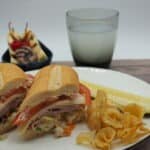Spread the mayo mixture on both halves of the bread. Lay down the slaw mix, turkey, cheese, and tomatoes. Cut in half and serve with chips.
