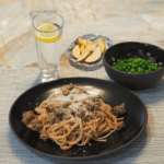 Serve: Serve spaghetti topped with Parmesan cheese, alongside sautéed peas, sliced pears, and lemon sparkling water.