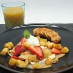 Spread cream cheese inside the crêpe shell, then fold or roll up. Top with whipped cream, strawberries and banana. Drizzle with honey. Serve with chicken sausage. Garnish with mint.