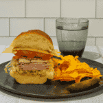 Cut in half, and serve with chips, pickle, and sparkling water.