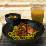 Plate the chicken and sauce over the zucchini noodles. Serve with white bean and arugula salad and mango lassi. Enjoy!