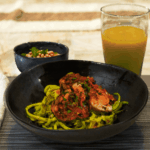 Serve the chicken over zucchini noodles, with white bean and arugula salad and mango lassi.