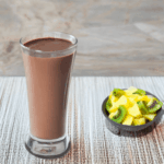 Serve the cacao superfood smoothie alongside the fresh fruit and enjoy.