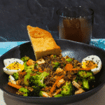 Place the egg in the bowl and cut in half. Garnish with scallions and sesame seeds. Serve with bread.