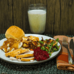 Serve turkey with mashed potatoes, gravy, stuffing, green bean casserole, cranberry sauce, sweet potato casserole, bread, and milk.