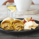Serve the wraps with sliced apple, sliced cheese, and lemon chia sparkling water.