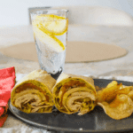 Serve the turkey wraps with potato chips and lemon chia sparkling water.