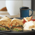 Serve the vegetable hummus wraps with cheese and apple slices, hot chamomile tea, and Divine Dish oatmeal banana cookies.
