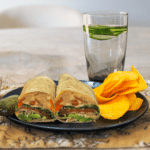 Serve the vegetable hummus wraps with a side of chips and pickle, and cucumber water.