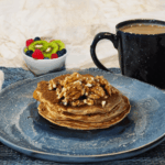 Serve pancakes topped with chopped walnuts and a generous drizzle of honey, with fruit and coffee.